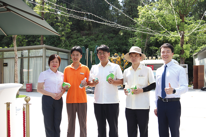 活動當(dāng)天,酒店副總經(jīng)理周慧清帶領(lǐng)管理團隊深入戶外工作一線,將一份份清涼飲品送到員工的手中,既表達(dá)對他們的關(guān)心和問候,也傳遞著酒店對員工的感謝和敬意。每位戶外崗位上的員工都陸續(xù)收到一份清涼禮包,內(nèi)有清涼茶飲品、礦泉水以及板藍(lán)根沖劑,確保他們在高溫下工作時能感受到來自酒店的關(guān)懷與支持。