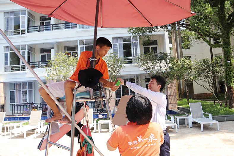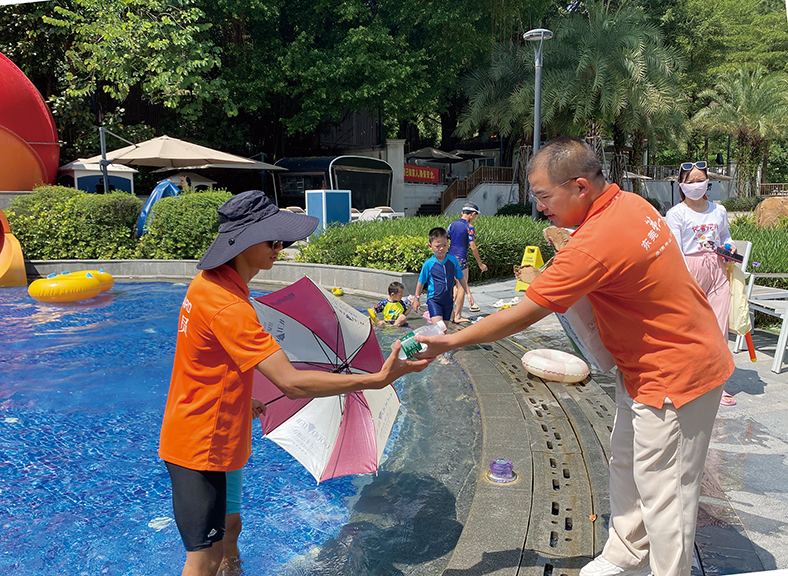 此外,樟木頭三正半山酒店、橋頭三正半山酒店也特別關(guān)注泳池邊保障客人安全的救生員們,在酒店大堂前及停車場區(qū)域有條不紊地指揮來往車輛、維持酒店治安和秩序的保安員們,以及高溫廚房環(huán)境的廚師們等。為了向他們表達(dá)敬意與關(guān)懷,酒店也適時地為他們準(zhǔn)備了清涼的飲料,保障他們在緊張忙碌的工作中也能保持良好的身體狀態(tài)。