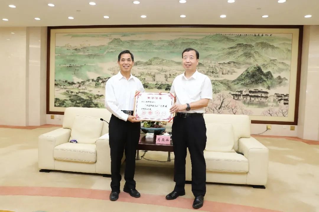 5.8月19日下午,東莞市委書記、市人大常委會主任肖亞非會見了載譽歸來的第三屆全國“最美擁軍人物”莫浩棠。會見活動由東莞市政府副市長黎軍主持,李克強副廳長宣讀了表彰通報,肖亞非書記向莫浩棠董事長頒發(fā)了榮譽證書。