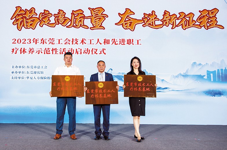 9.6月14日上午,東莞市總工會在東莞迎賓館舉行了2023年東莞工會技術(shù)工人和先進(jìn)職工療休養(yǎng)活動啟動儀式?;顒又?,市人大常委會副主任、市總工會主席羅軍文為入選“東莞市技術(shù)工人療休養(yǎng)基地”的12家單位頒發(fā)了牌匾。我集團(tuán)旗下三家酒店均榮譽入選“東莞市技術(shù)工人療休養(yǎng)基地”,橋頭三正半山酒店總經(jīng)理李啟清、樟木頭三正半山酒店總經(jīng)理施文靜、塘廈三正半山溫泉酒店副總經(jīng)理潘林等出席,并分別代表各自酒店上臺接受了牌匾。