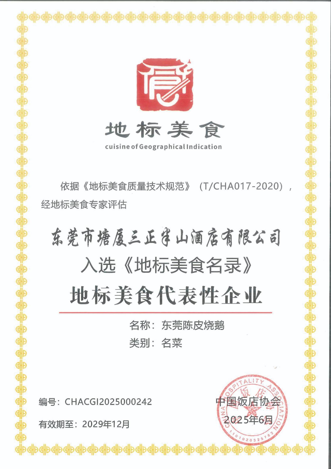 7.6月份,在中國飯店協(xié)會主辦的中國地標(biāo)美食評審中,塘廈三正半山溫泉酒店憑借漢宮中餐廳招牌菜“東莞陳皮燒鵝”成功入選《地標(biāo)美食名錄》,榮獲“地標(biāo)美食名菜”稱號,酒店餐飲部副總監(jiān)兼出品部總監(jiān)藍(lán)武強被認(rèn)定為該菜品傳承人。同時,酒店被授予“地標(biāo)美食代表性企業(yè)”榮譽。