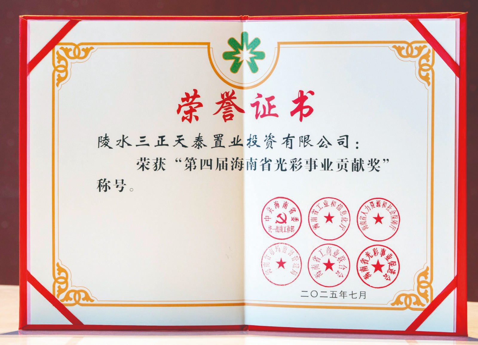 6.7月17日,第四屆海南省非公有制經(jīng)濟(jì)人士優(yōu)秀中國特色社會主義事業(yè)建設(shè)者暨光彩事業(yè)貢獻(xiàn)獎表彰大會隆重舉行。陵水三正天泰置業(yè)投資有限公司憑借在光彩事業(yè)領(lǐng)域的突出貢獻(xiàn)與持續(xù)踐行社會責(zé)任的顯著成果,榮獲“第四屆海南省光彩事業(yè)貢獻(xiàn)獎”。