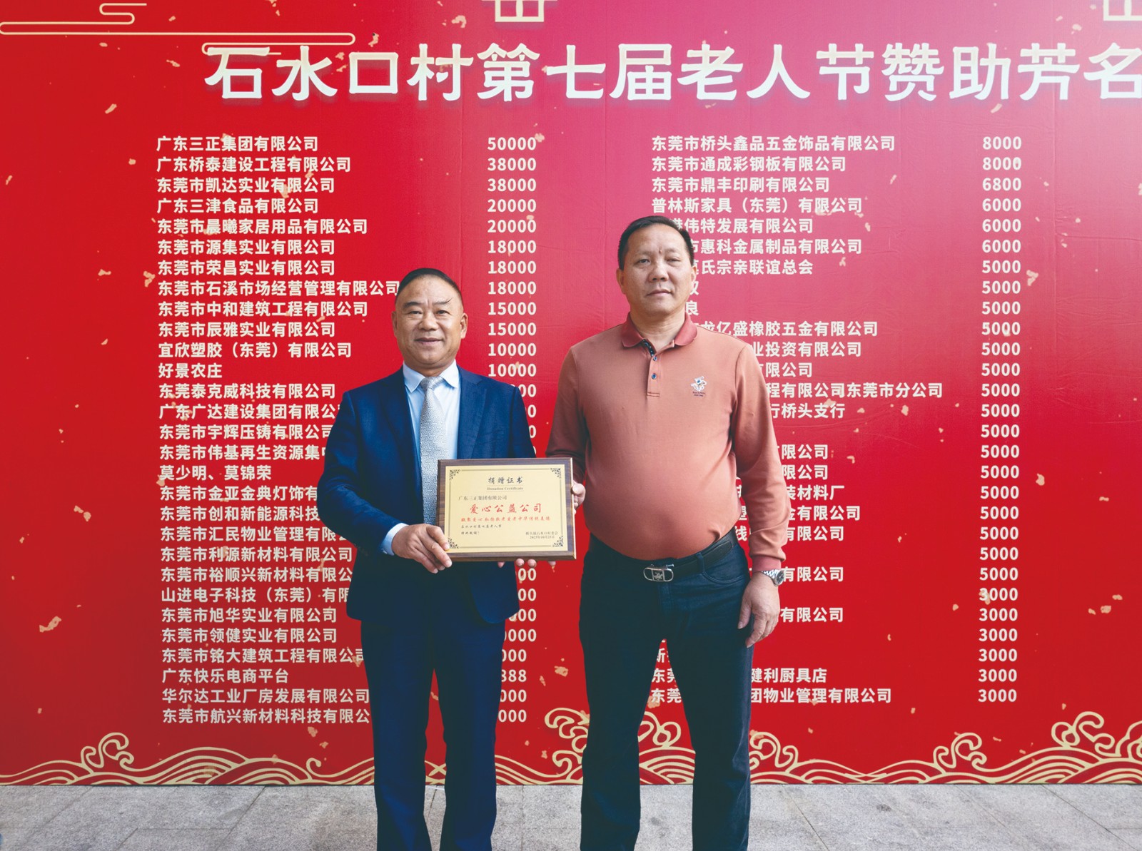 2.11月14日,橋頭鎮(zhèn)石水口村舉行了第七屆老人節(jié),我集團(tuán)捐贈5萬元,與社會各界共同助力此次關(guān)愛活動。據(jù)了解,本次活動約1362名老人受到關(guān)懷。為表示感謝,石水口村委向我集團(tuán)頒發(fā)了“愛心公益公司”捐贈證書。