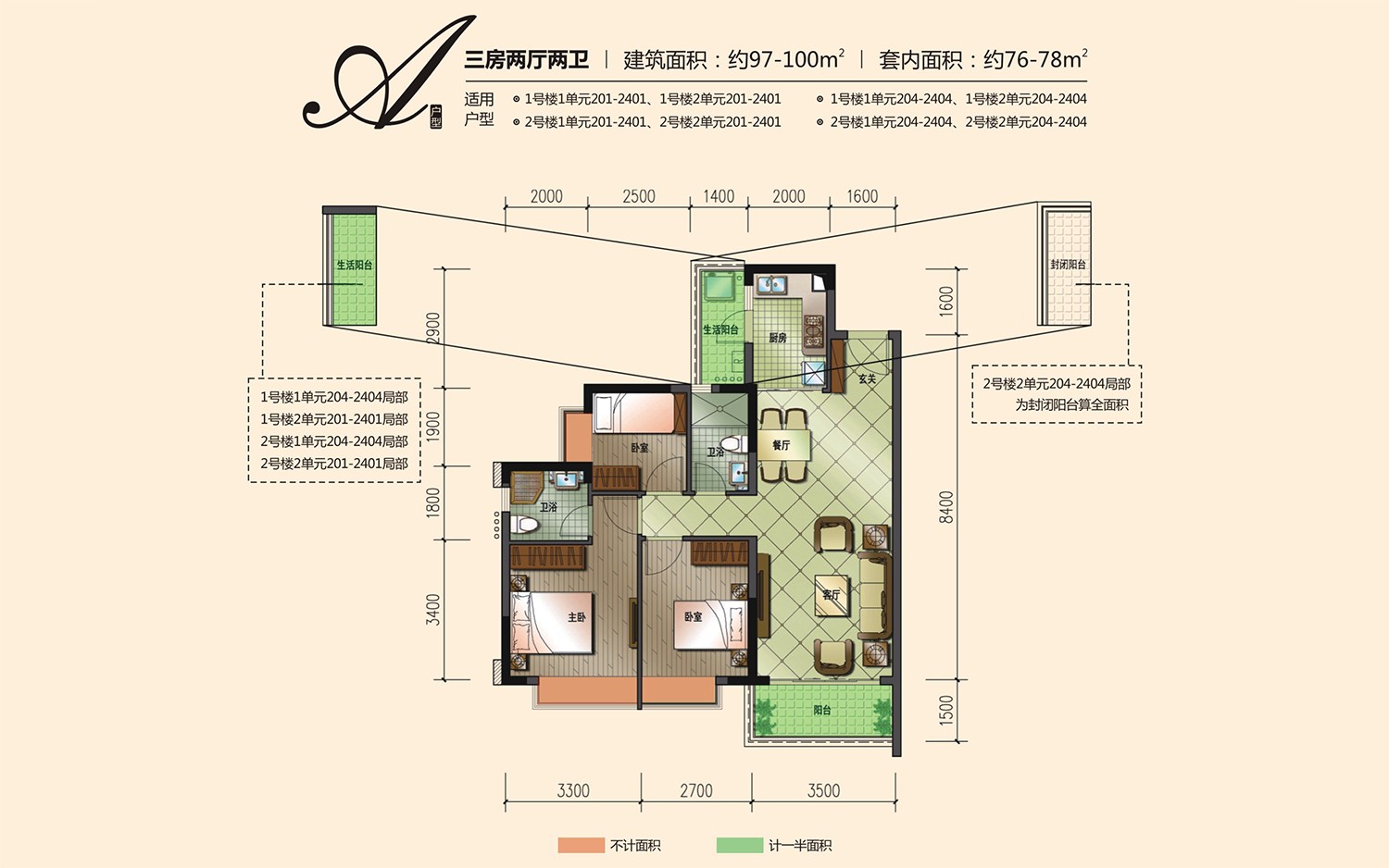 三房兩廳兩衛(wèi) 建筑面積:約97-100m2 套內(nèi)面積:約76-78m2。