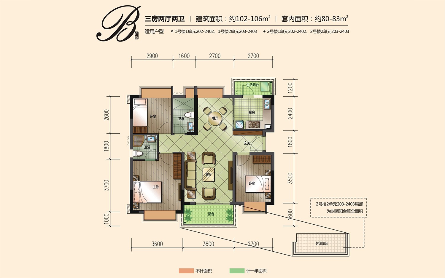 三房兩廳兩衛(wèi) 建筑面積:約102-106m2 套內(nèi)面積:約80-83m2。