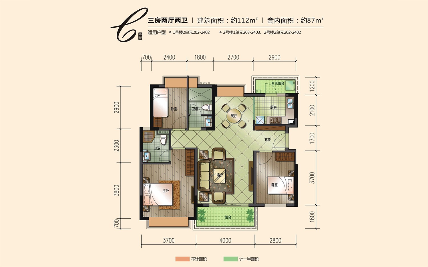 三房兩廳兩衛(wèi) 建筑面積:約112m2 套內(nèi)面積:約87m2。