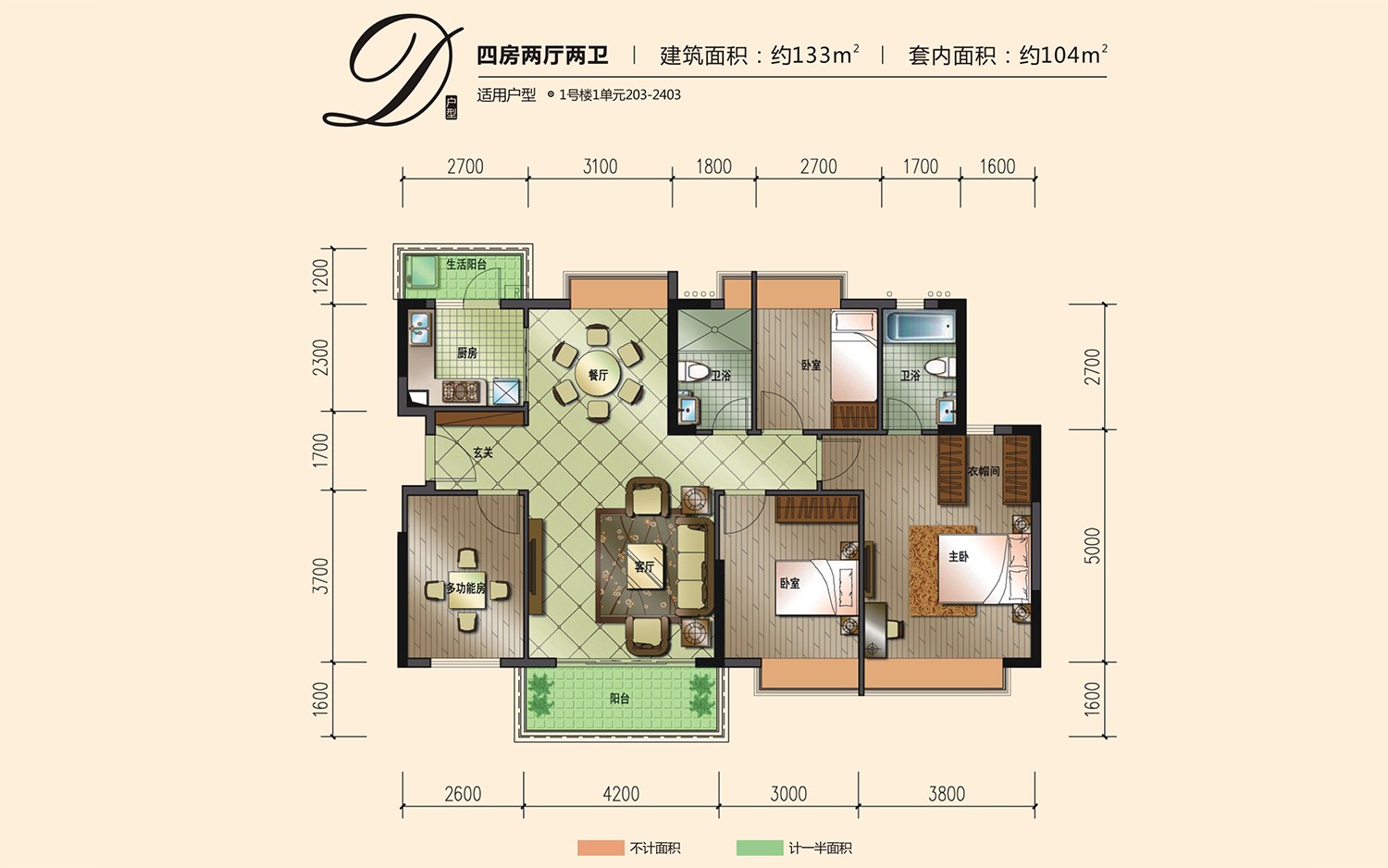 四房兩廳兩衛(wèi) 建筑面積:約133m2 套內(nèi)面積:約104m2。